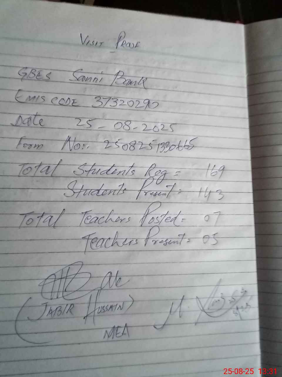 | Total no. of Classrooms: 10 No. of Classrooms Used for Teaching: 6 No. of Classrooms Storing Old Furniture, FTBs, etc: 0Comments if Any: One teacher name Abida Sagheer PST retired from service but her name present in pmiu application and sis also Random class check list not updated in pmiu application Boundary wall partially |