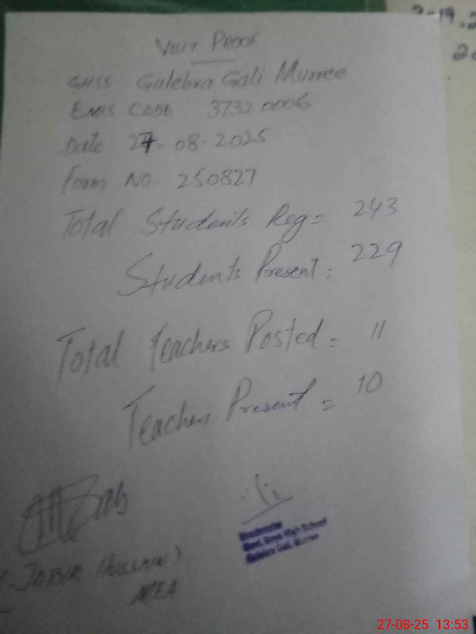 | Attendance Register | Head Teacher | MEA with School | Visit Proof |