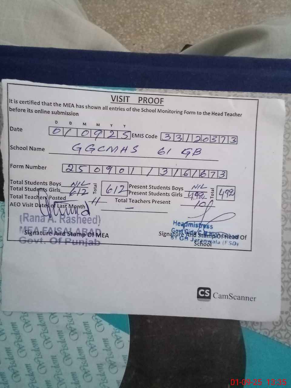 | EMIS Code: 33120373 | Name of School: GGCMHS CHAK 61 GB JARANWALA | |||
