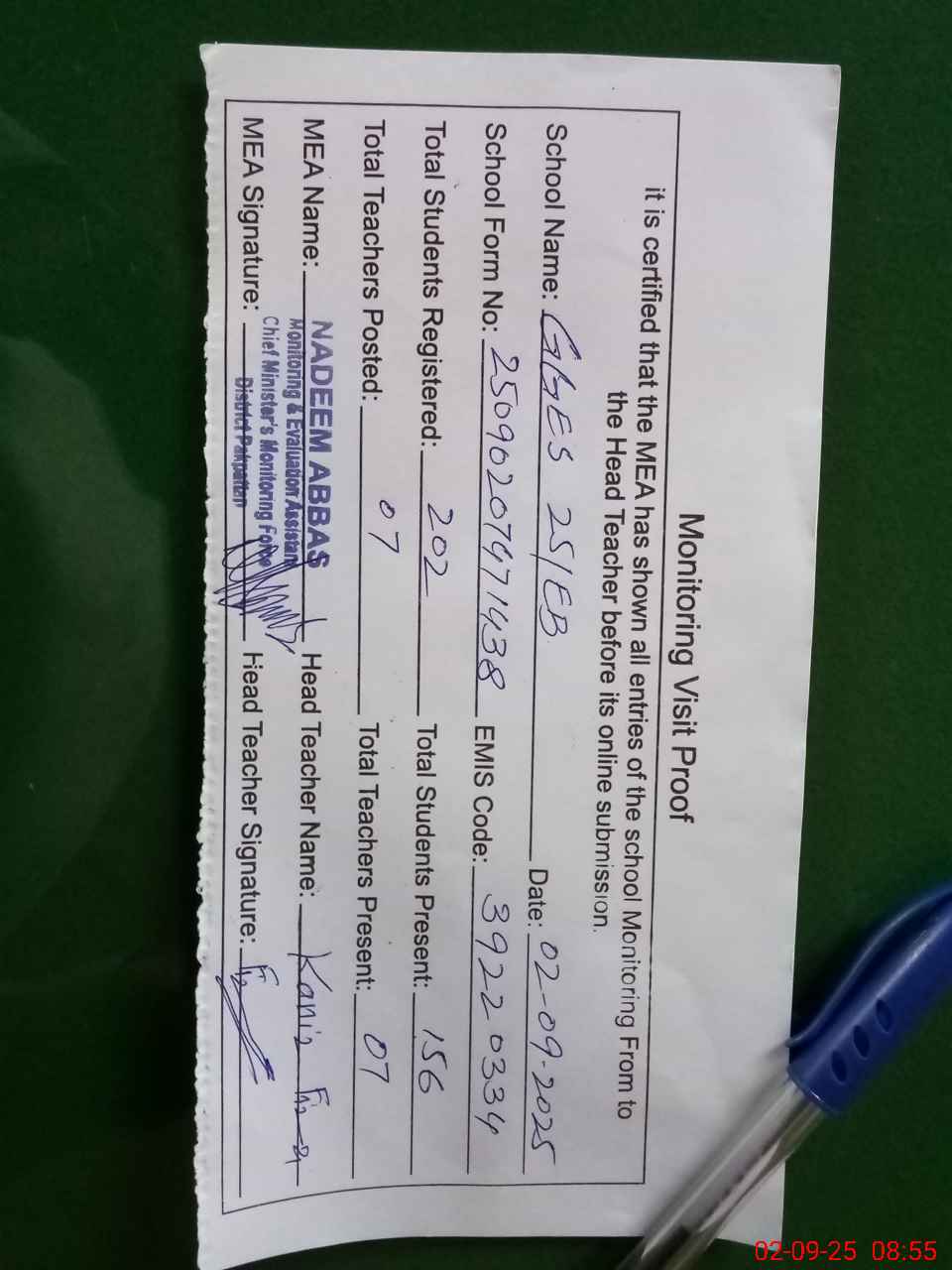 | Attendance Register | Head Teacher | MEA with School | Visit Proof |