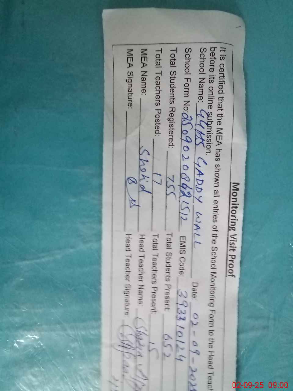 | Attendance Register | Head Teacher | MEA with School | Visit Proof |