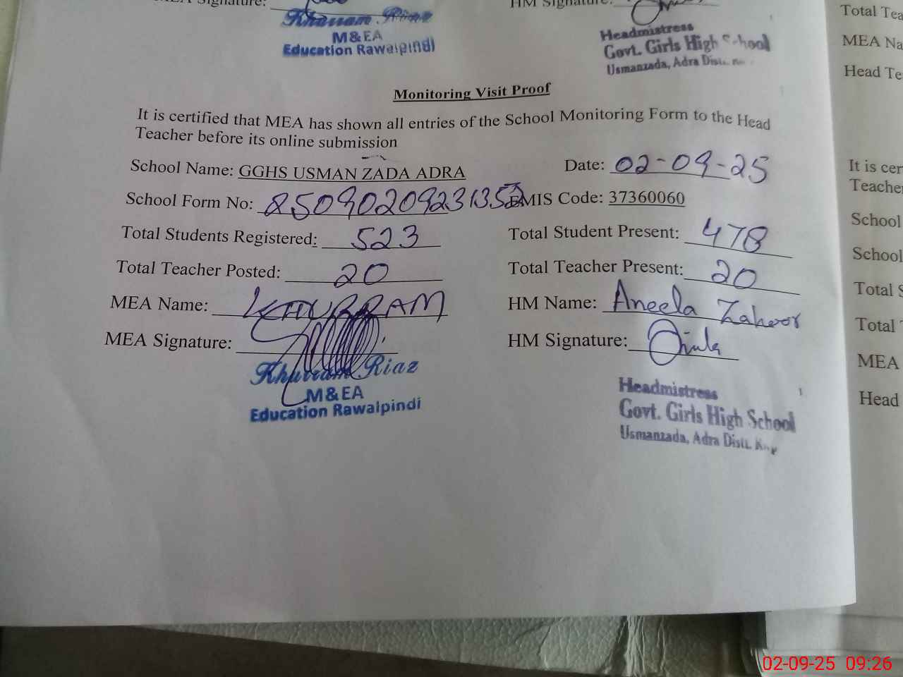 | EMIS Code: 37360060 | Name of School: GGHS USMAN ZADA ADRA | |||