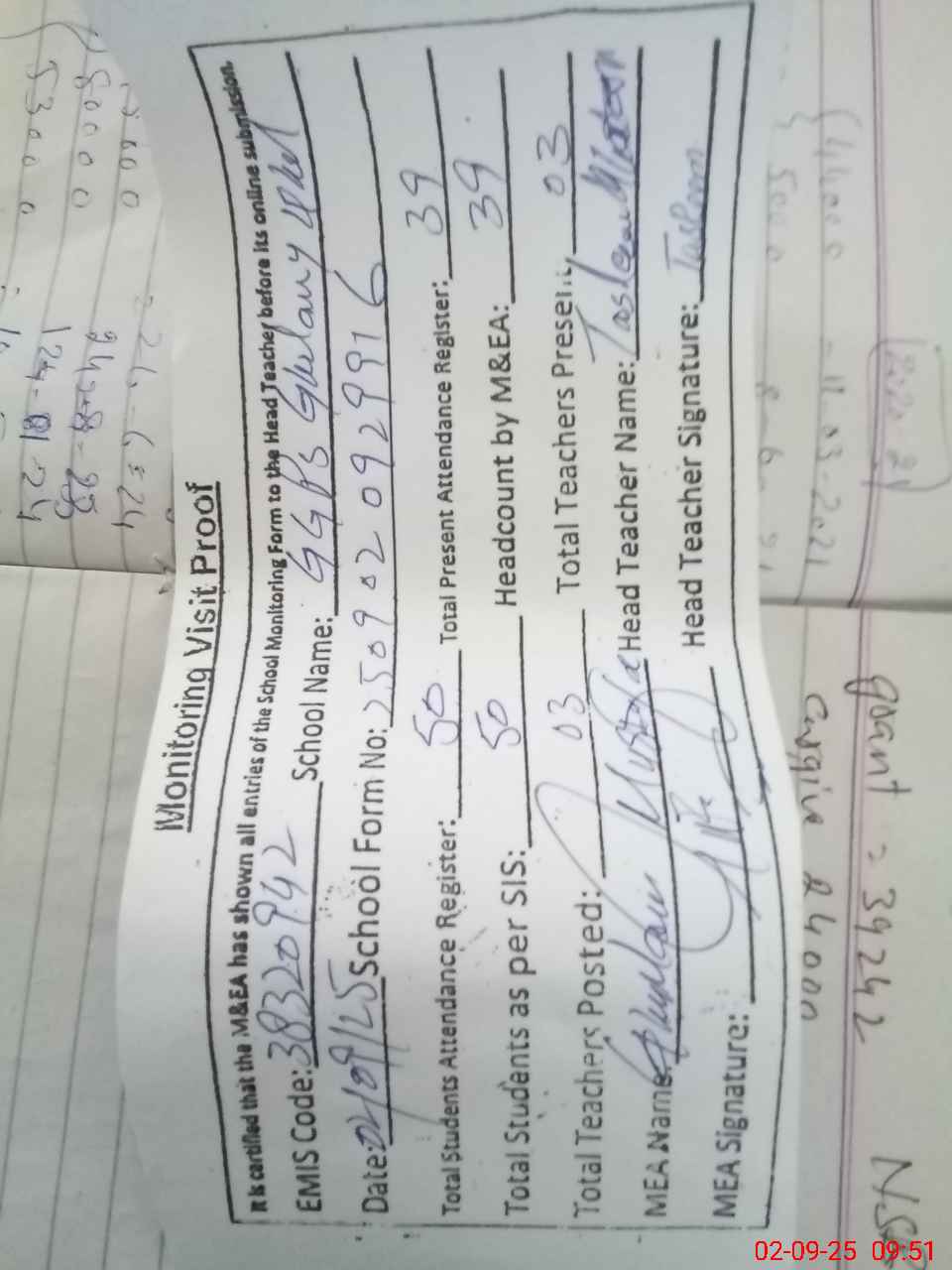 | Attendance Register | Head Teacher | MEA with School | Visit Proof |