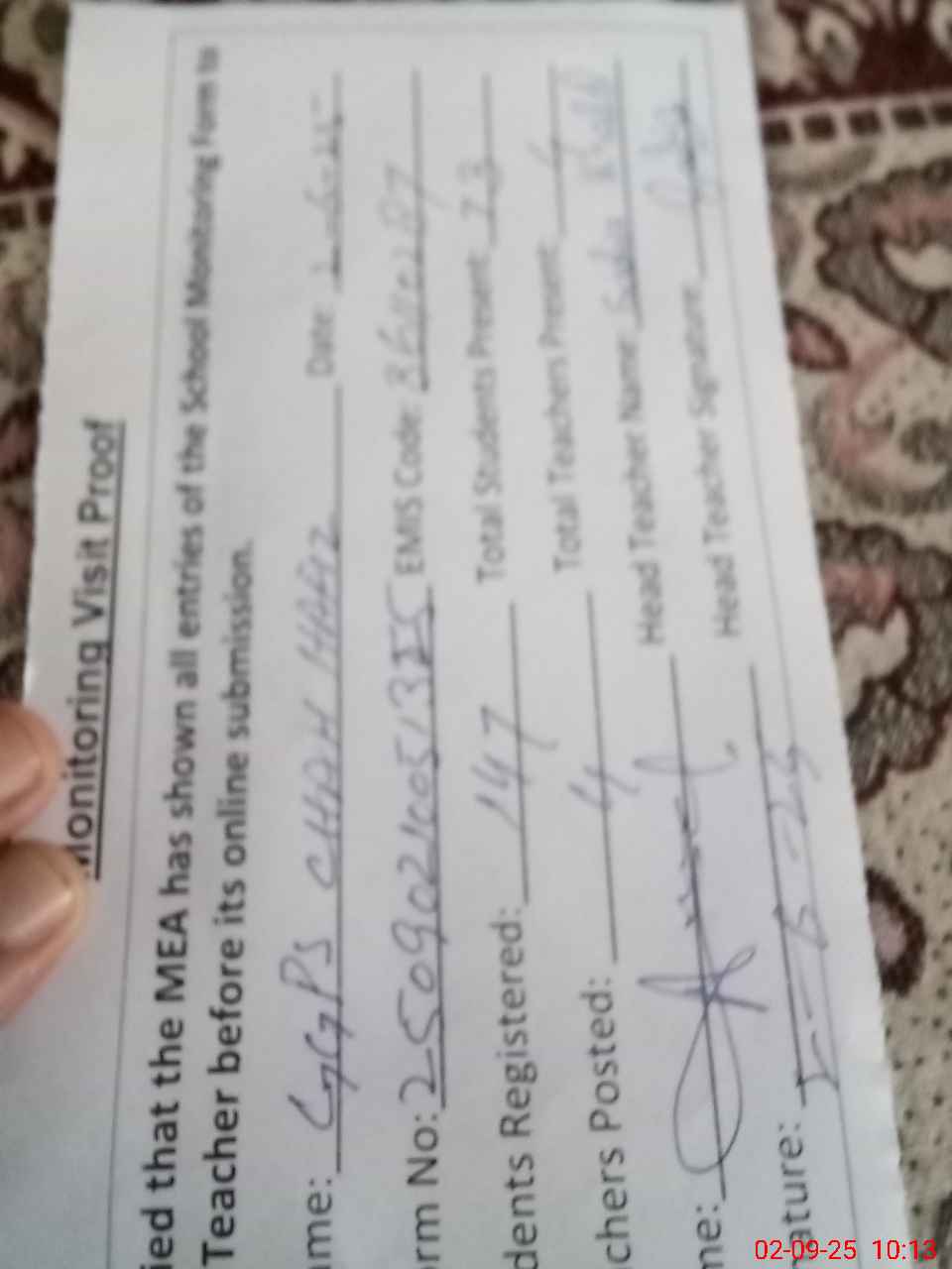 | Attendance Register | Head Teacher | MEA with School | Visit Proof |
