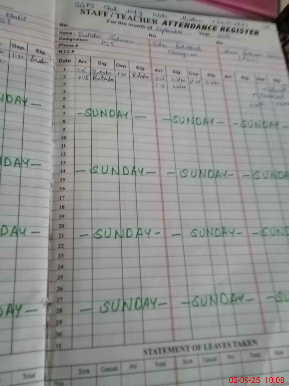 | CNIC | Full Name | Designation | R/C | Absence During Last Calender Month |