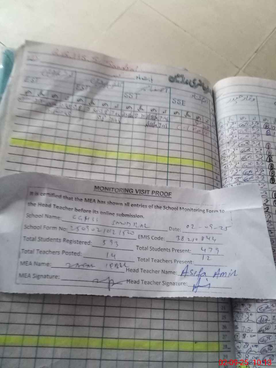 | Attendance Register | Head Teacher | MEA with School | Visit Proof |