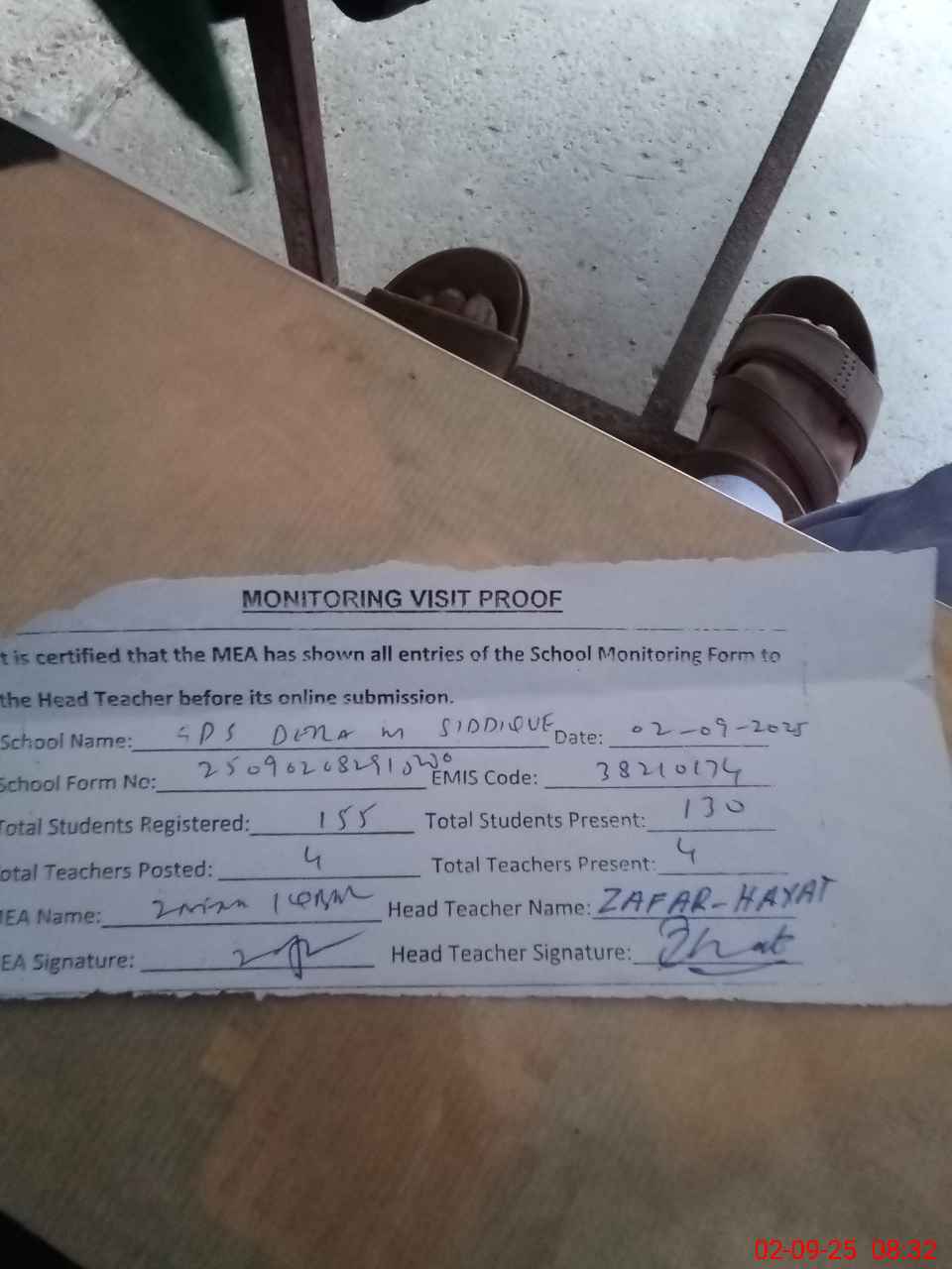 | Attendance Register | Head Teacher | MEA with School | Visit Proof |