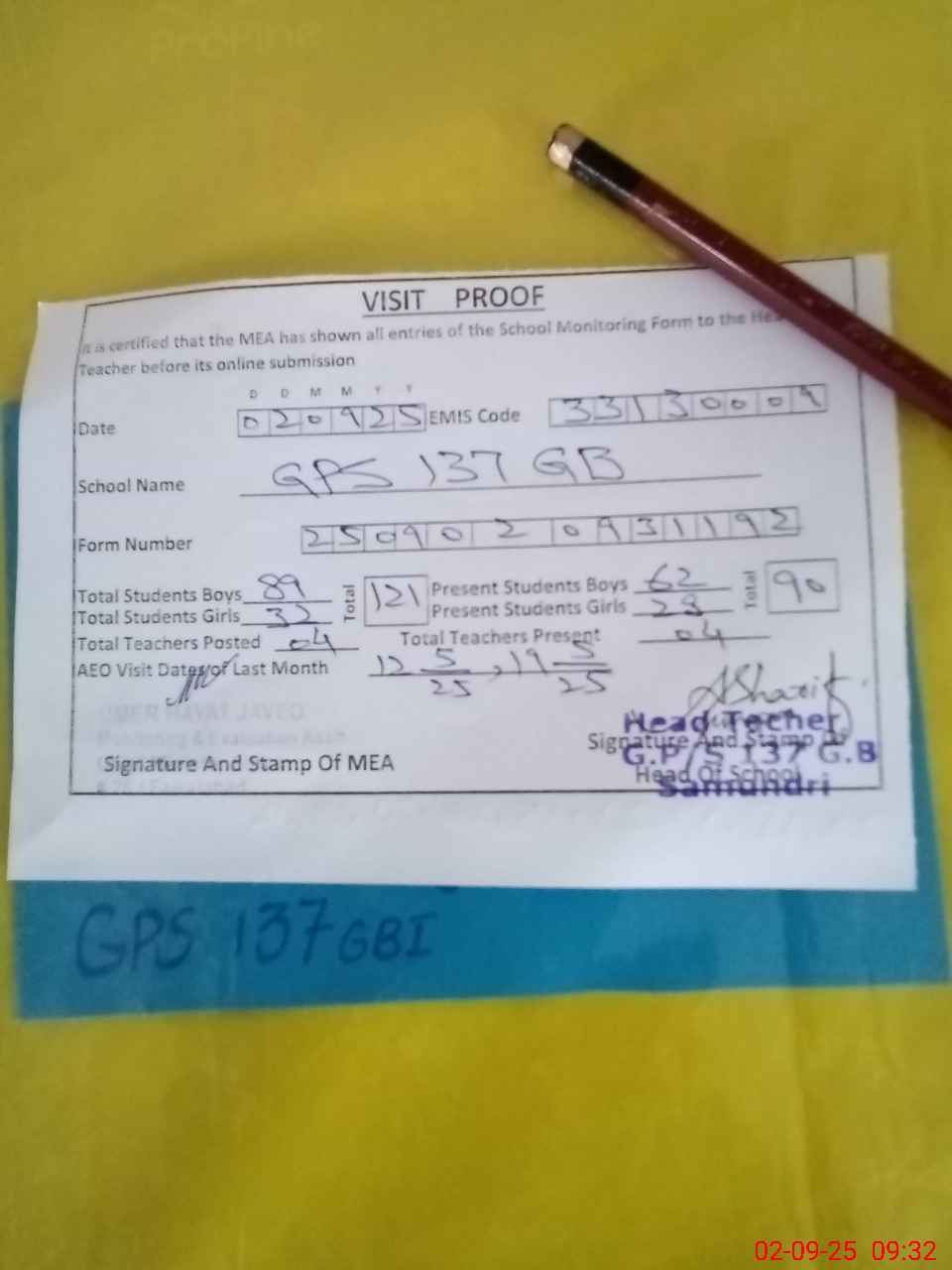 | EMIS Code: 33130009 | Name of School: GPS CHAK 137 GB I SAMUNDRI | |||