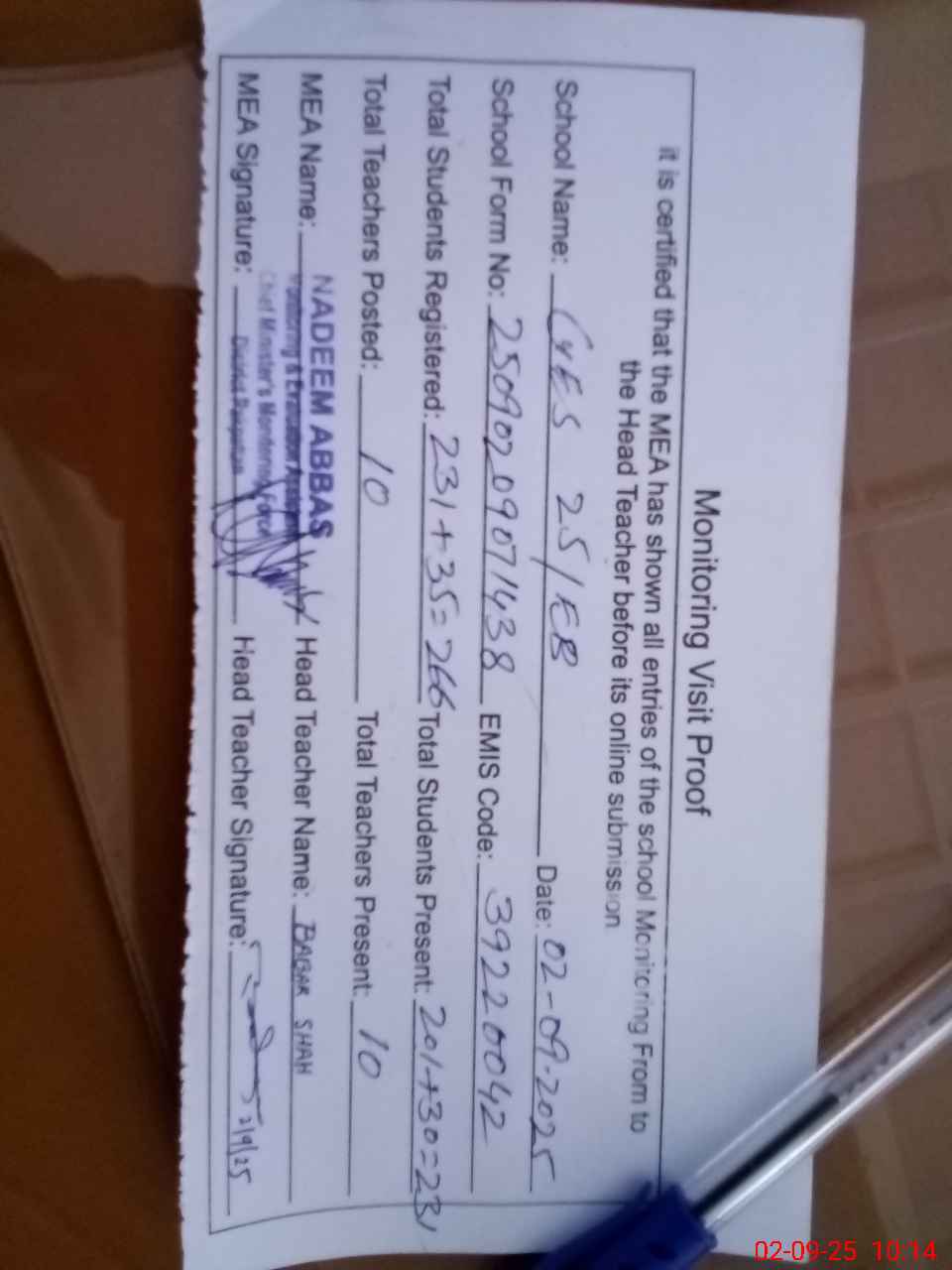 | Attendance Register | Head Teacher | MEA with School | Visit Proof |