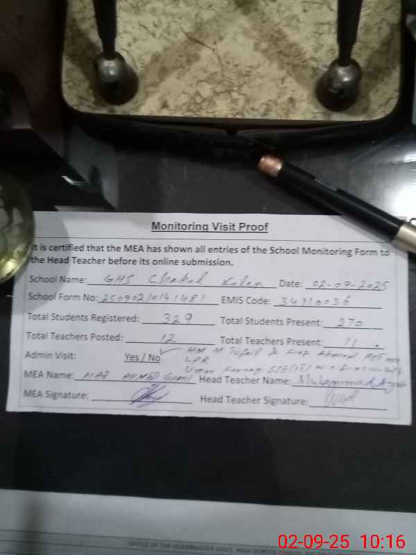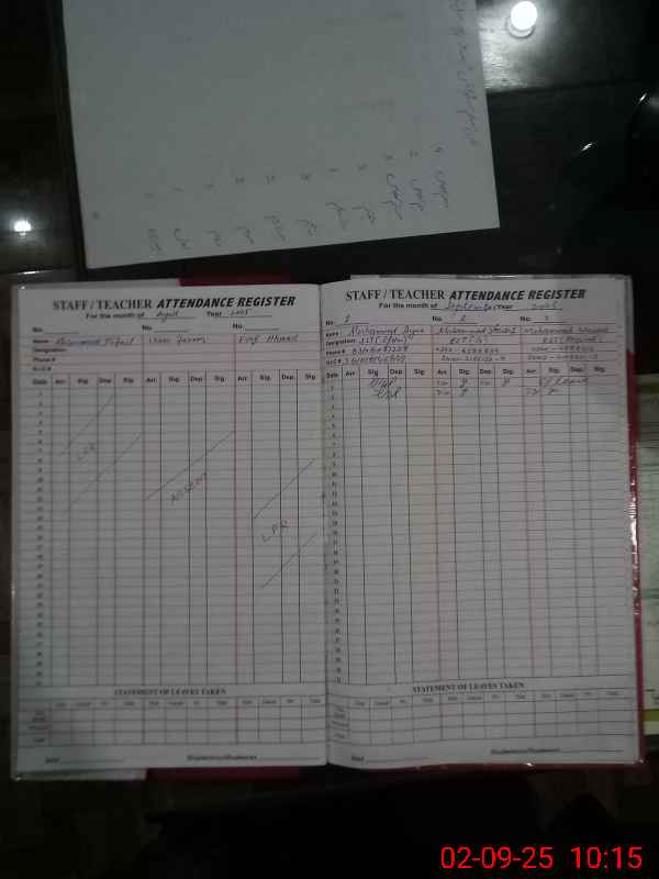 | Remarks (Use Separate Page if Required): Attendance of teaching staff and students on SIS Software is not updated at the time of visit Following Teachers are on LPR w e f 07 January 2025 HM Muhammad Tufail Fiaz Ahmad PST Teacher Umar Farooq SSE IT absent from his duties w e f 01 November 2024 Data as per provided by School staff and found during physical visit | |||||