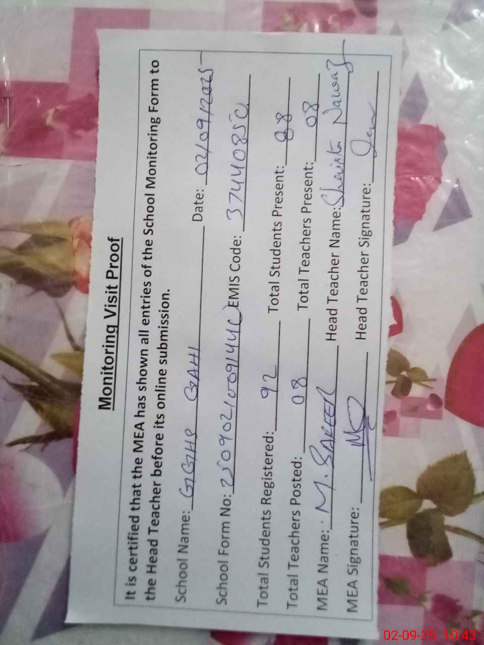 | Attendance Register | Head Teacher | MEA with School | Visit Proof |