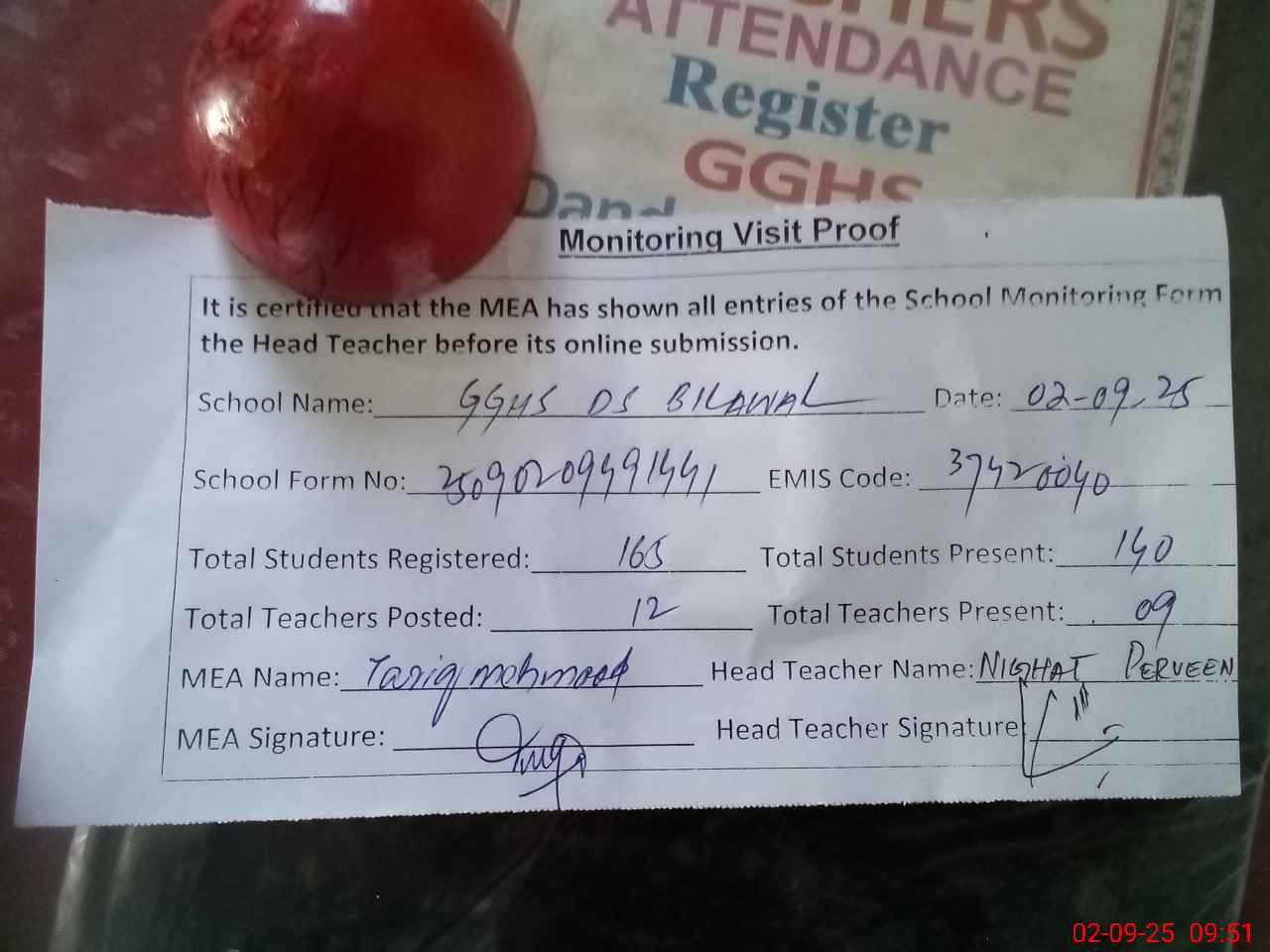 | Attendance Register | Head Teacher | MEA with School | Visit Proof |