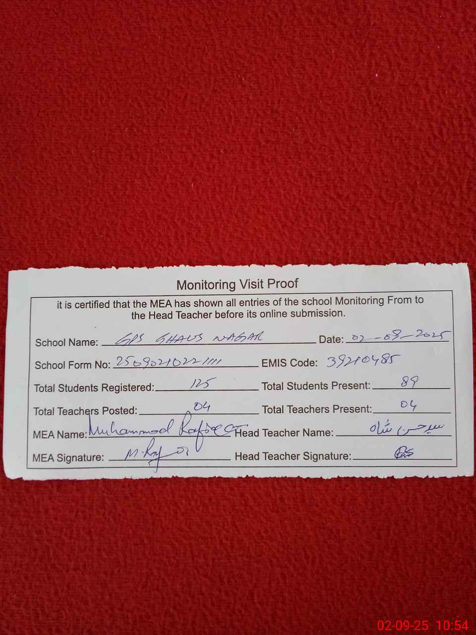 | Attendance Register | Head Teacher | MEA with School | Visit Proof |