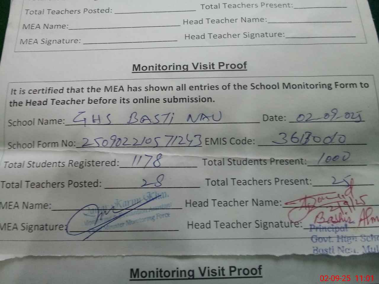 | Monitoring Date: 02-09-2025 | Start Time: 02-09-2025 09:59 AM | End Time: 02-09-2025 11:01 AM | Name of MEA: Qa**** Ka**** Kh**** | |
