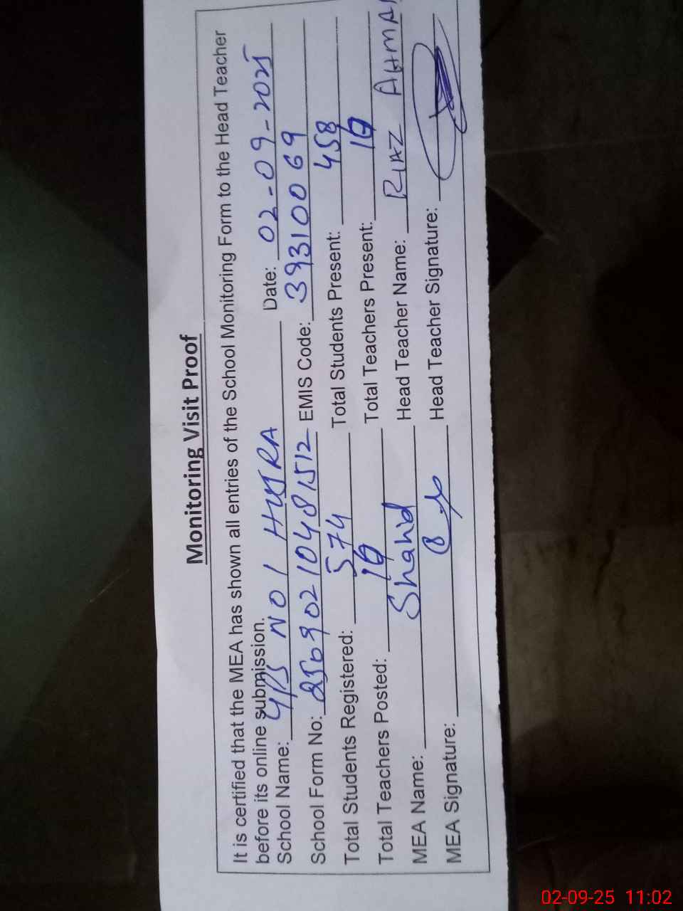 | Attendance Register | Head Teacher | MEA with School | Visit Proof |
