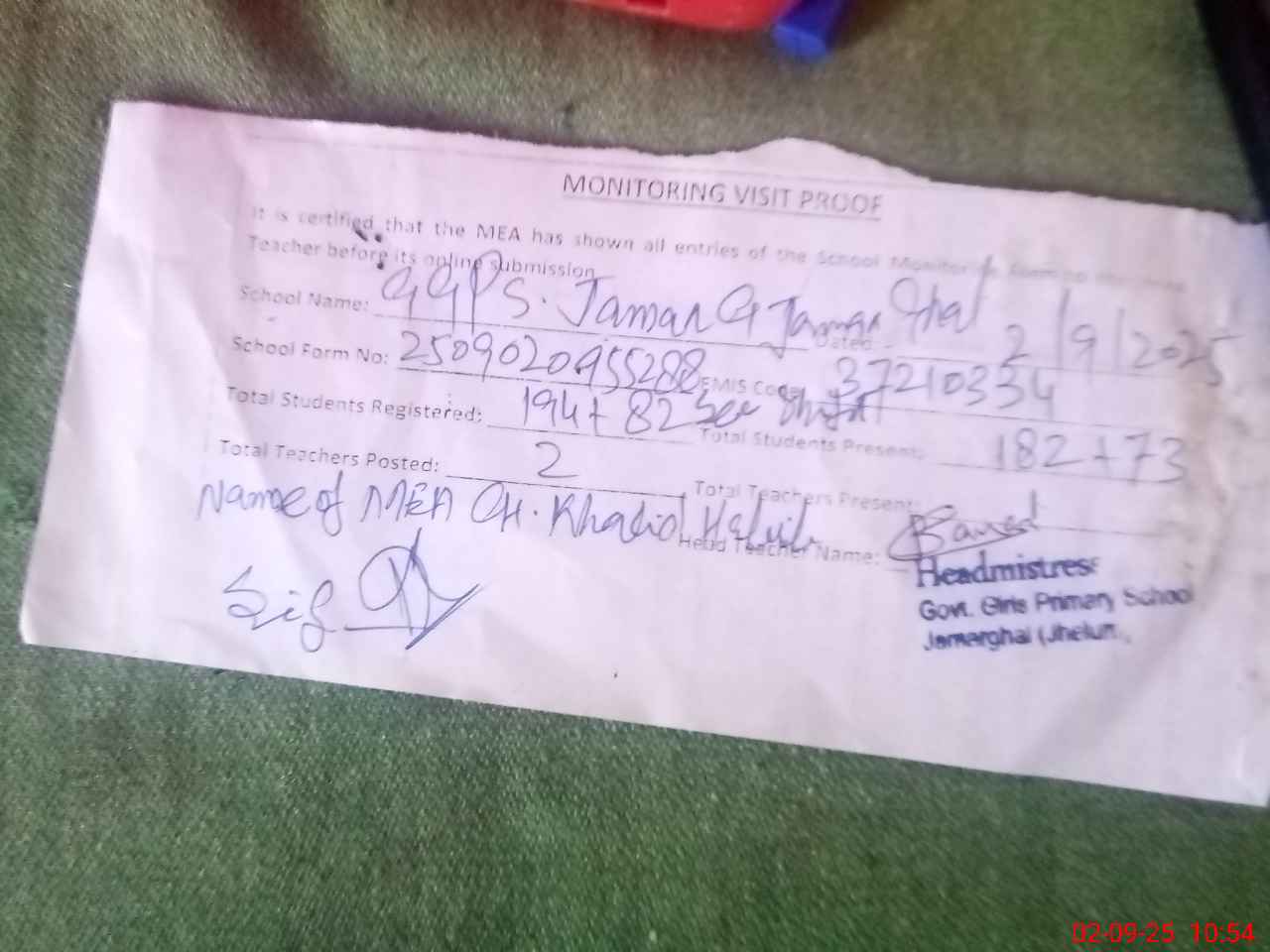 | Certified that this School was Inspected by the Undersigned MEA/DMO Today and the Information Stated Above is as Per Record. | |||||