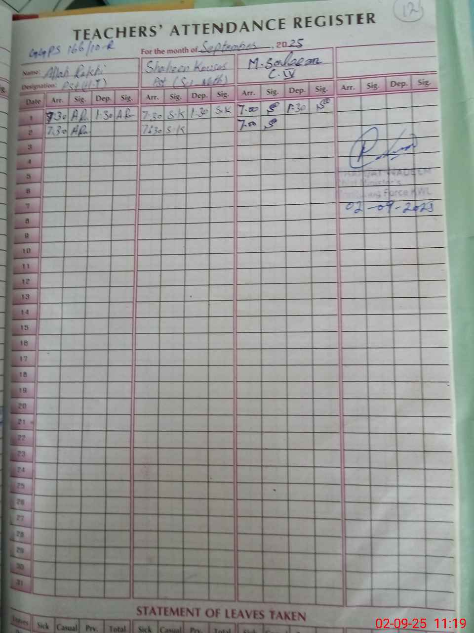 | Remarks (Use Separate Page if Required): As per attendance registers of afternoon classes all students are absent on 1 September 2025 Boys portion of school closed not in use having 2 class rooms and 2 toilets boundary Wall height less than 4 feet | |||||