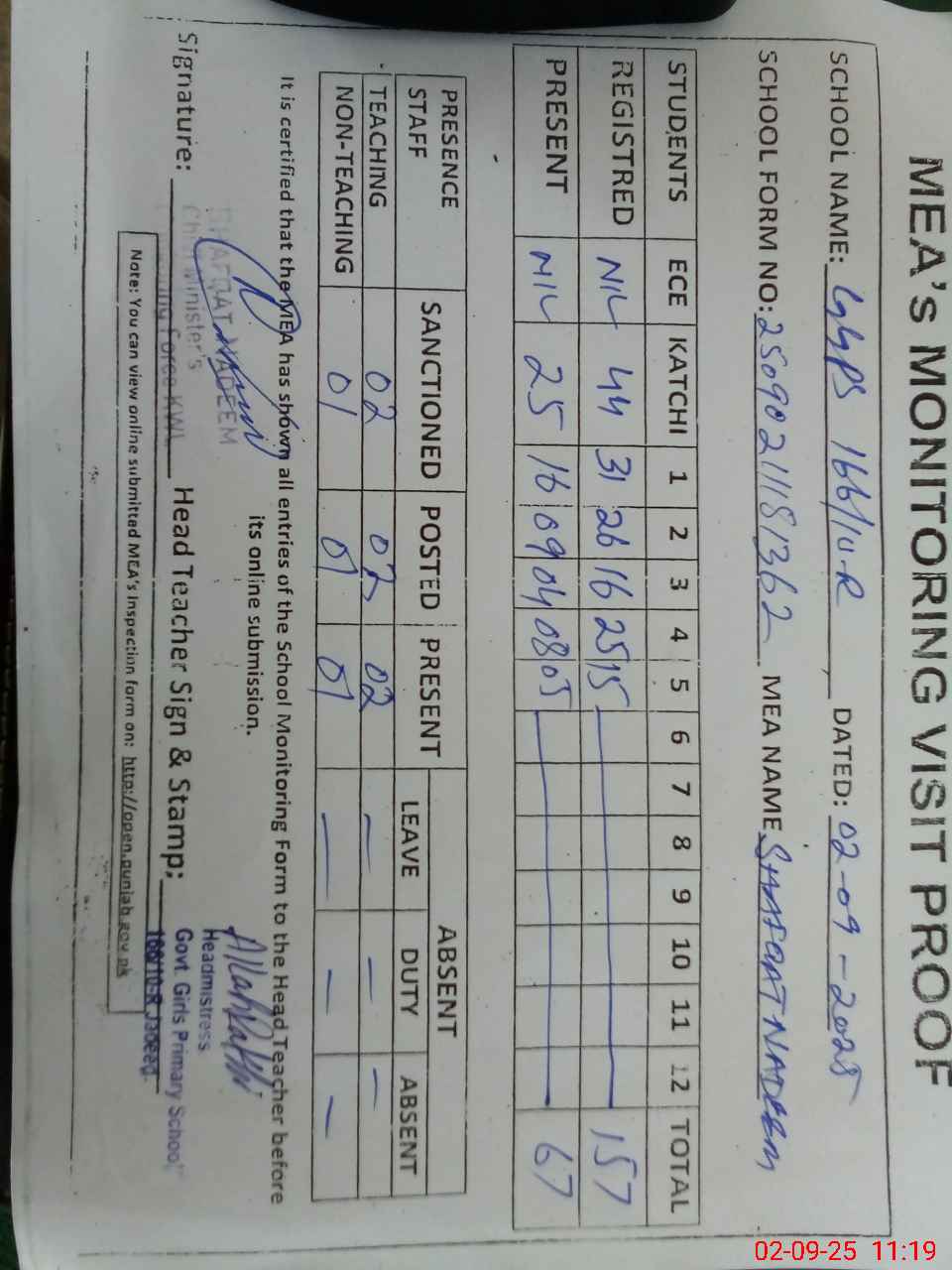| Attendance Register | Head Teacher | MEA with School | Visit Proof |