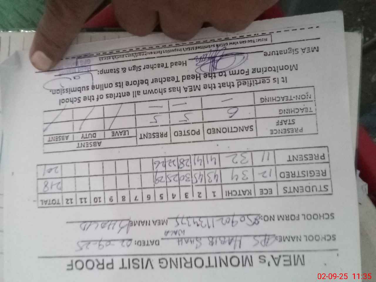 | Attendance Register | Head Teacher | MEA with School | Visit Proof |