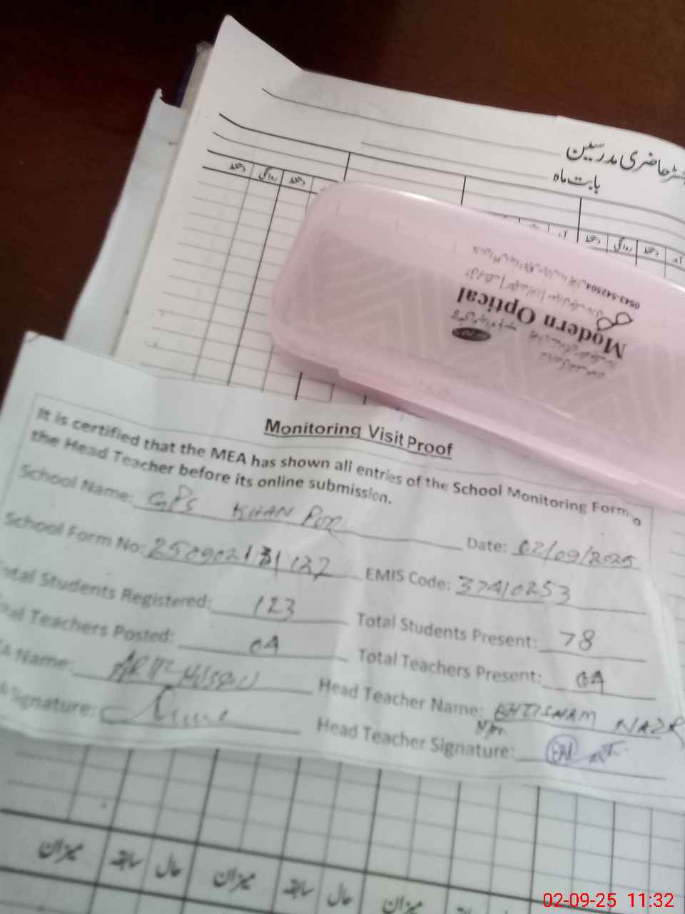 | Attendance Register | Head Teacher | MEA with School | Visit Proof |