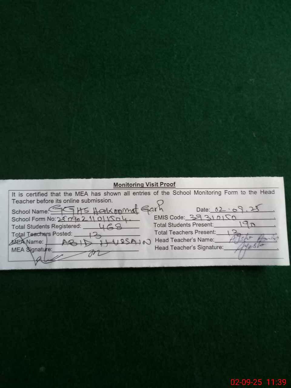 | Attendance Register | Head Teacher | MEA with School | Visit Proof |