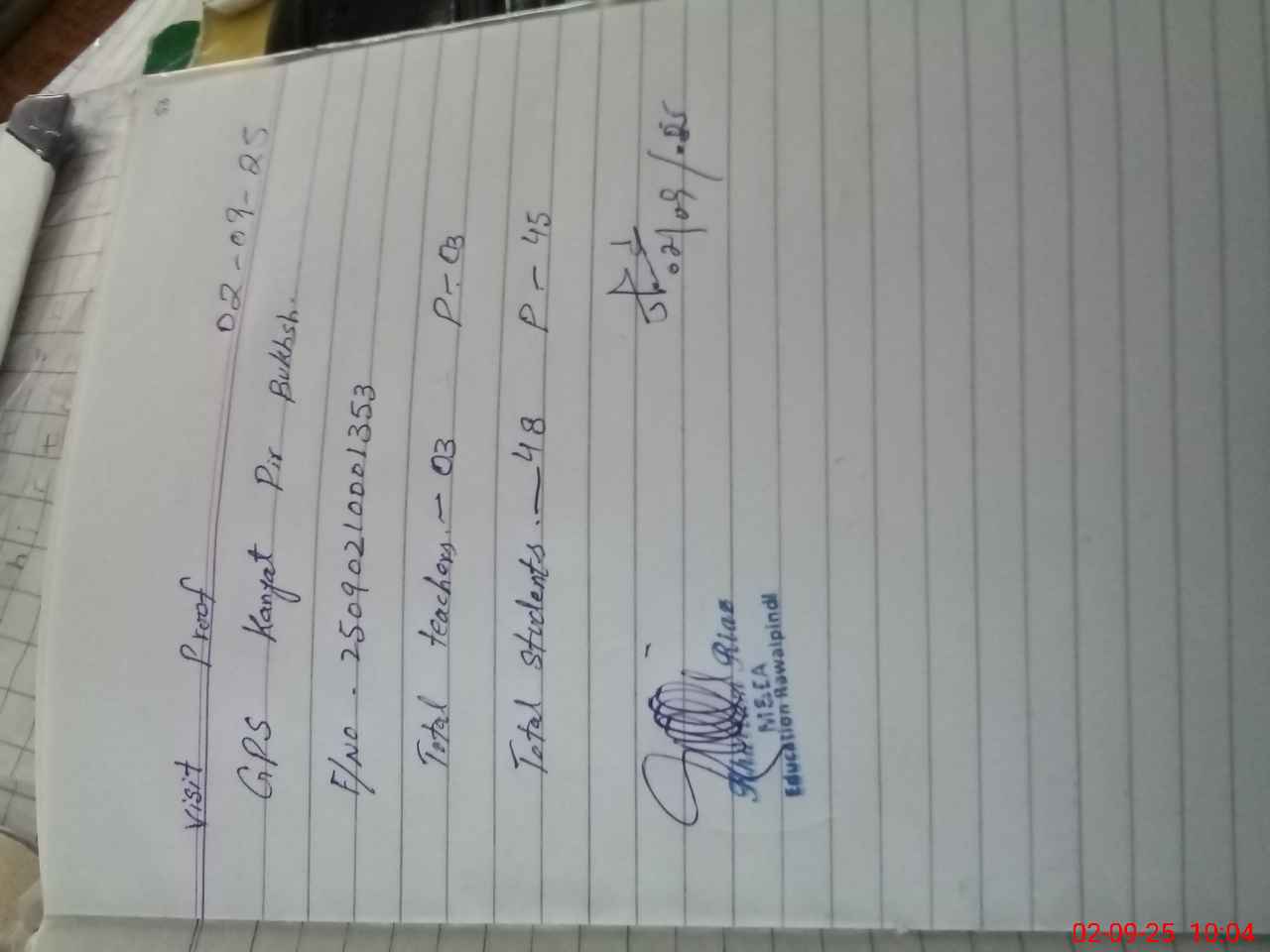 | Attendance Register | Head Teacher | MEA with School | Visit Proof |