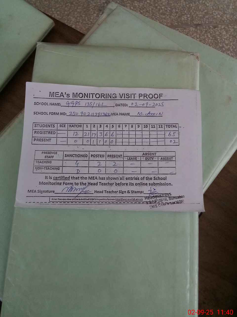 | Attendance Register | Head Teacher | MEA with School | Visit Proof |