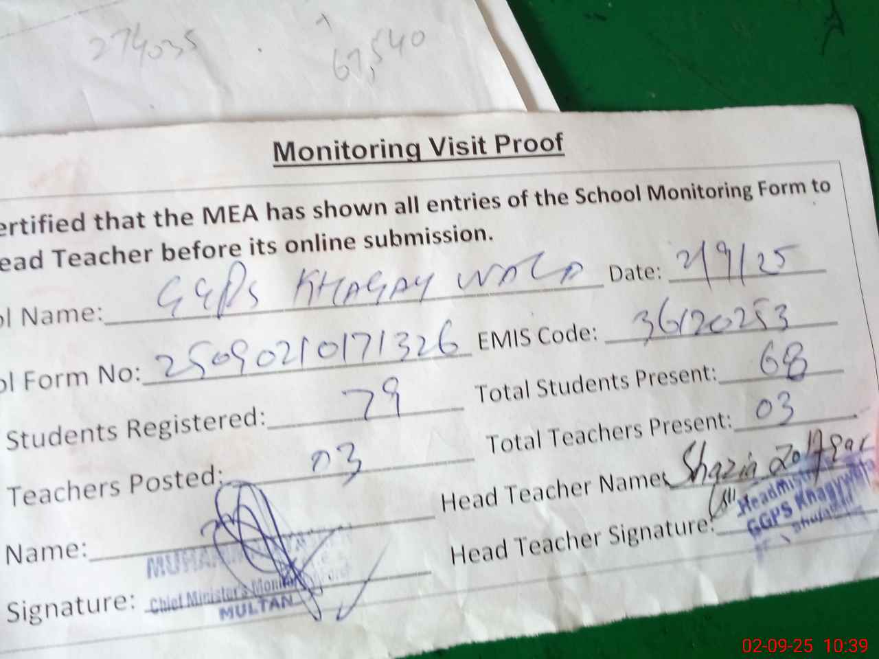 | Certified that this School was Inspected by the Undersigned MEA/DMO Today and the Information Stated Above is as Per Record. | |||||