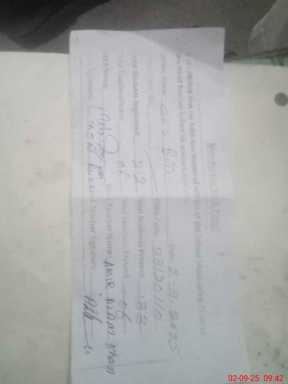 | Attendance Register | Head Teacher | MEA with School | Visit Proof |