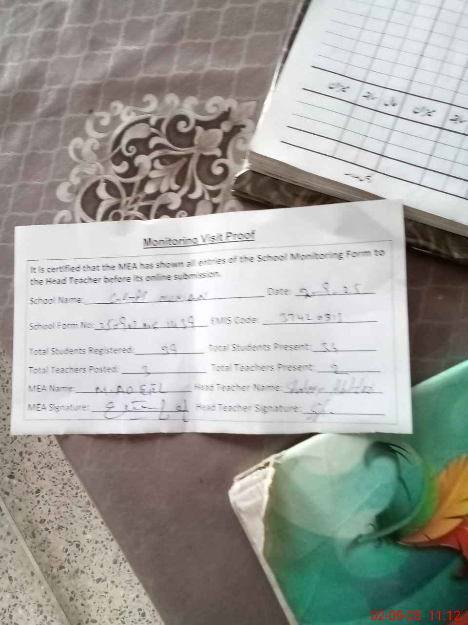 | Attendance Register | Head Teacher | MEA with School | Visit Proof |