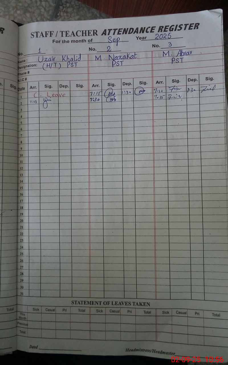 | CNIC | Full Name | Designation | R/C | Absence During Last Calender Month |
