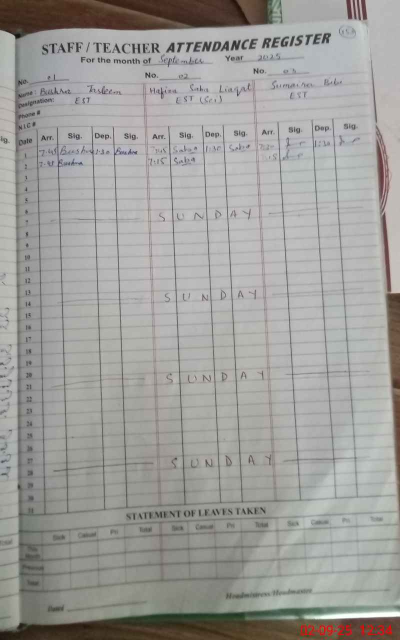 | CNIC | Full Name | Designation | R/C | Absence During Last Calender Month |