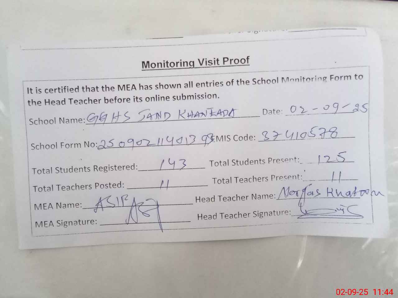 | Attendance Register | Head Teacher | MEA with School | Visit Proof |