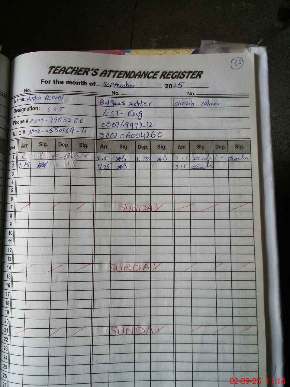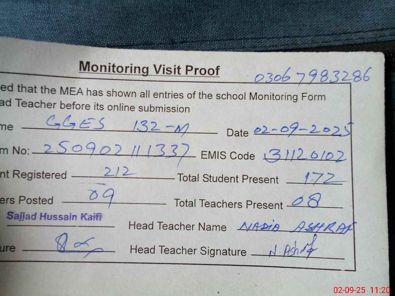 | Name: NA**** AS**** Designation: (School Headmaster's/Headmistress's) SST HEAD Phone/Cell Number: 03**** |