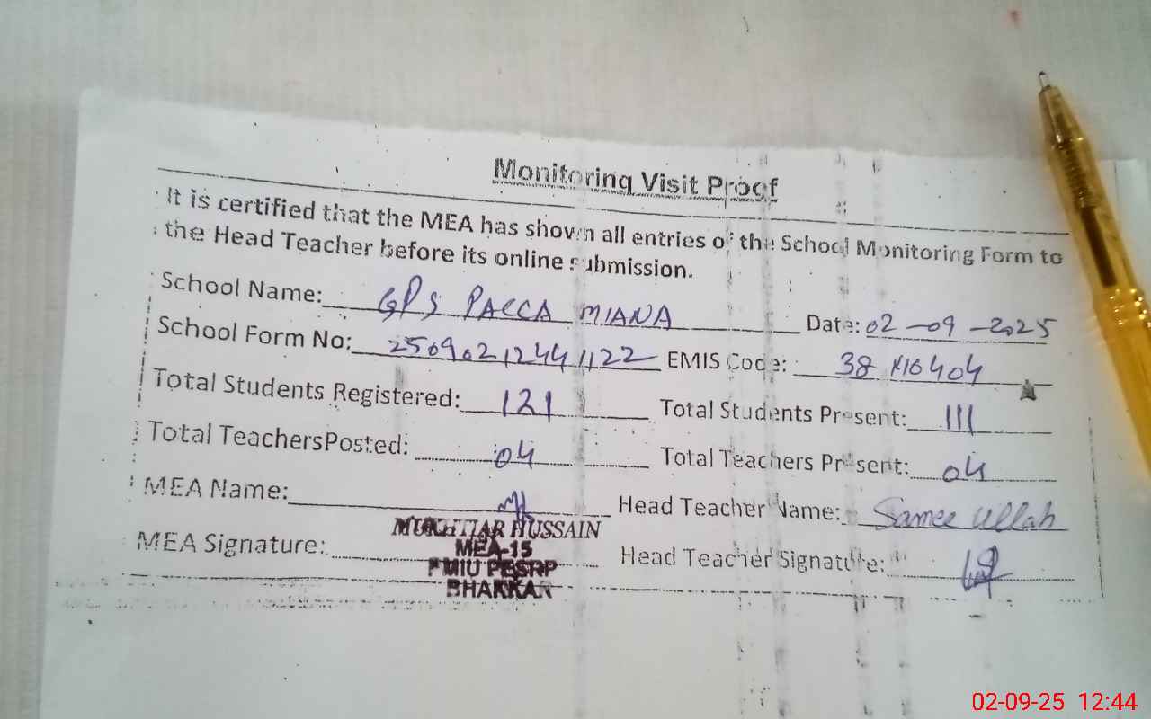 | Attendance Register | Head Teacher | MEA with School | Visit Proof |