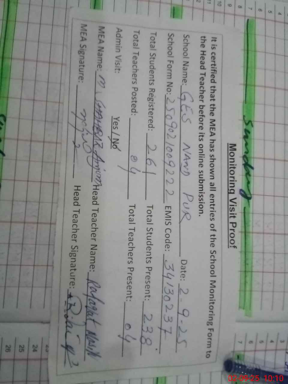 | Attendance Register | Head Teacher | MEA with School | Visit Proof |