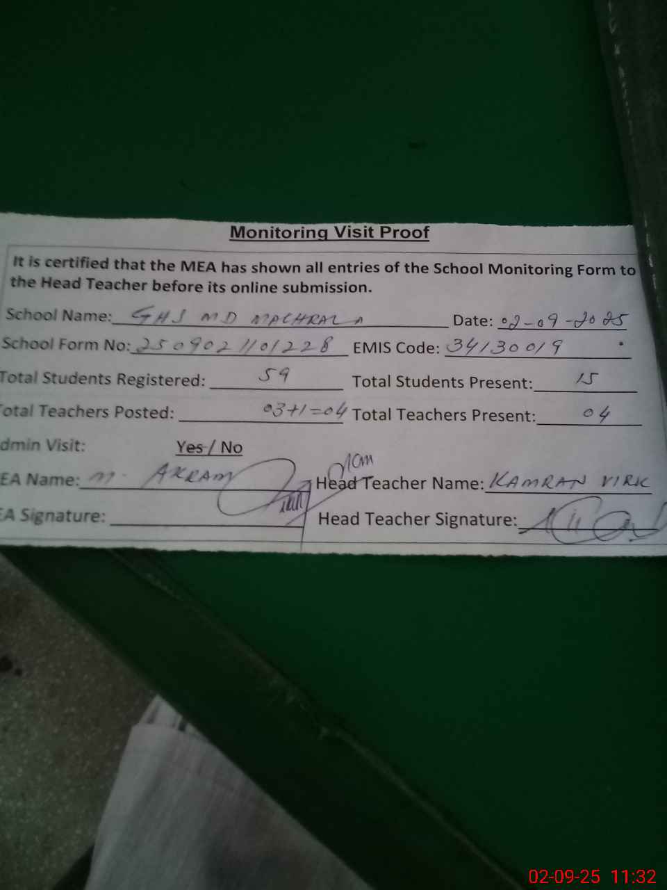 | Attendance Register | Head Teacher | MEA with School | Visit Proof |