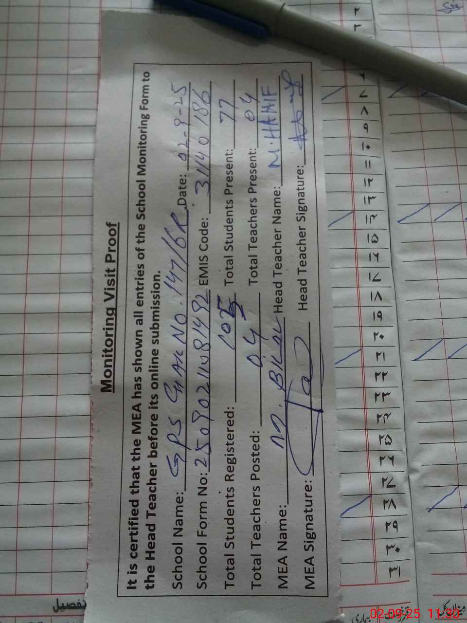 | Attendance Register | Head Teacher | MEA with School | Visit Proof |