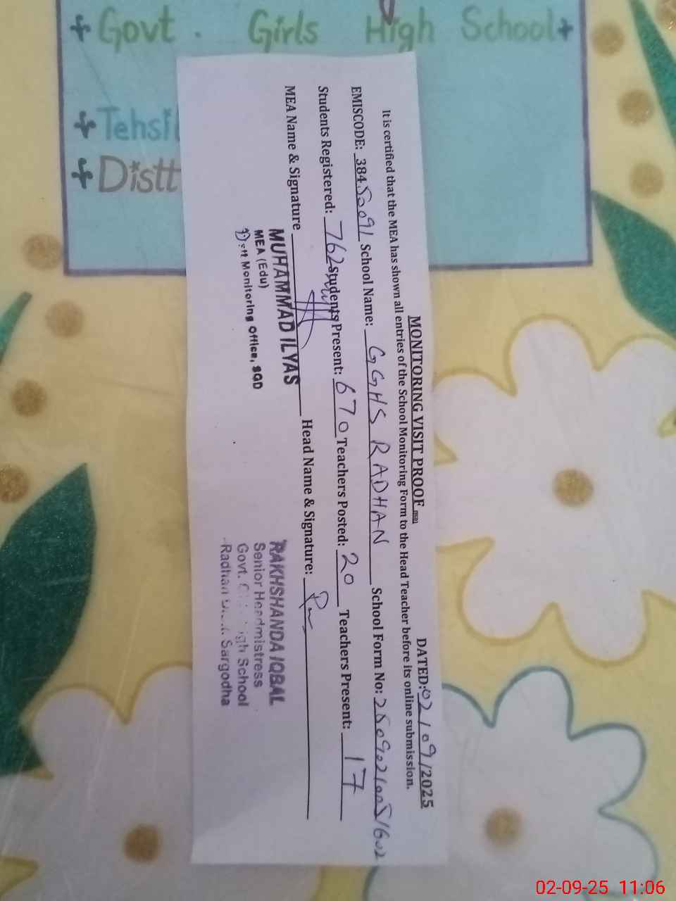 | EMIS Code: 38450091 | Name of School: GGHS RADHAN | |||