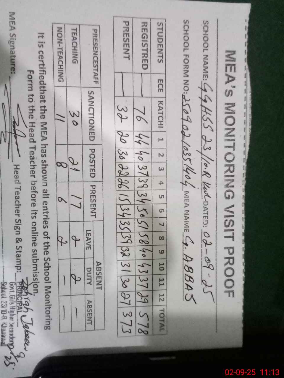 | Attendance Register | Head Teacher | MEA with School | Visit Proof |