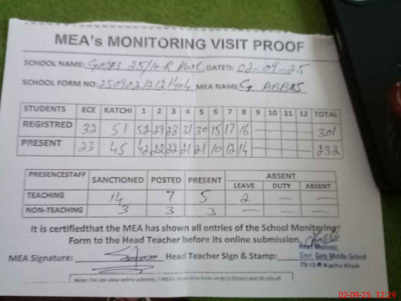 | Attendance Register | Head Teacher | MEA with School | Visit Proof |