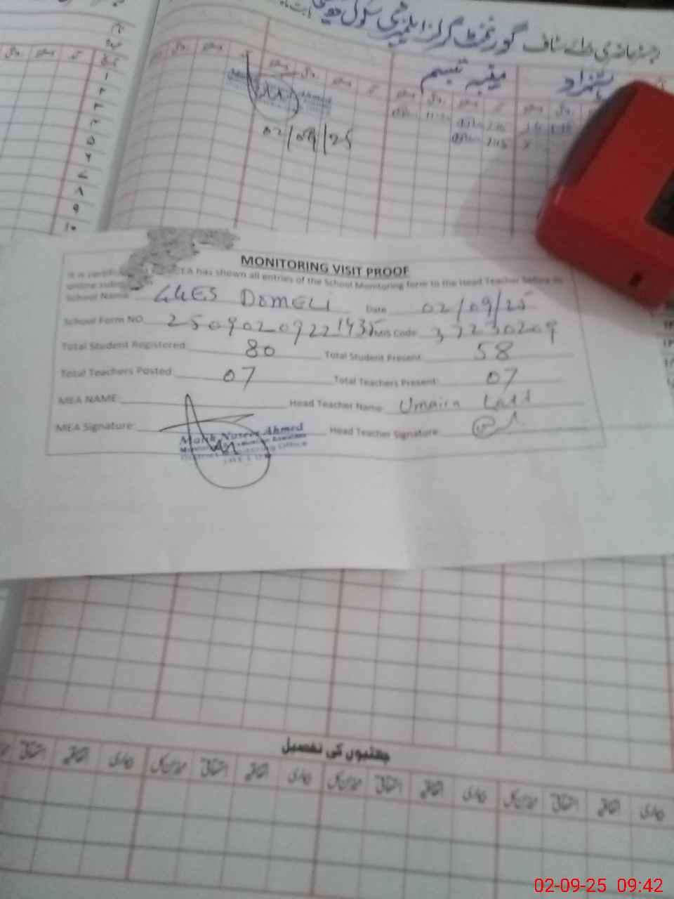 | Attendance Register | Head Teacher | MEA with School | Visit Proof |