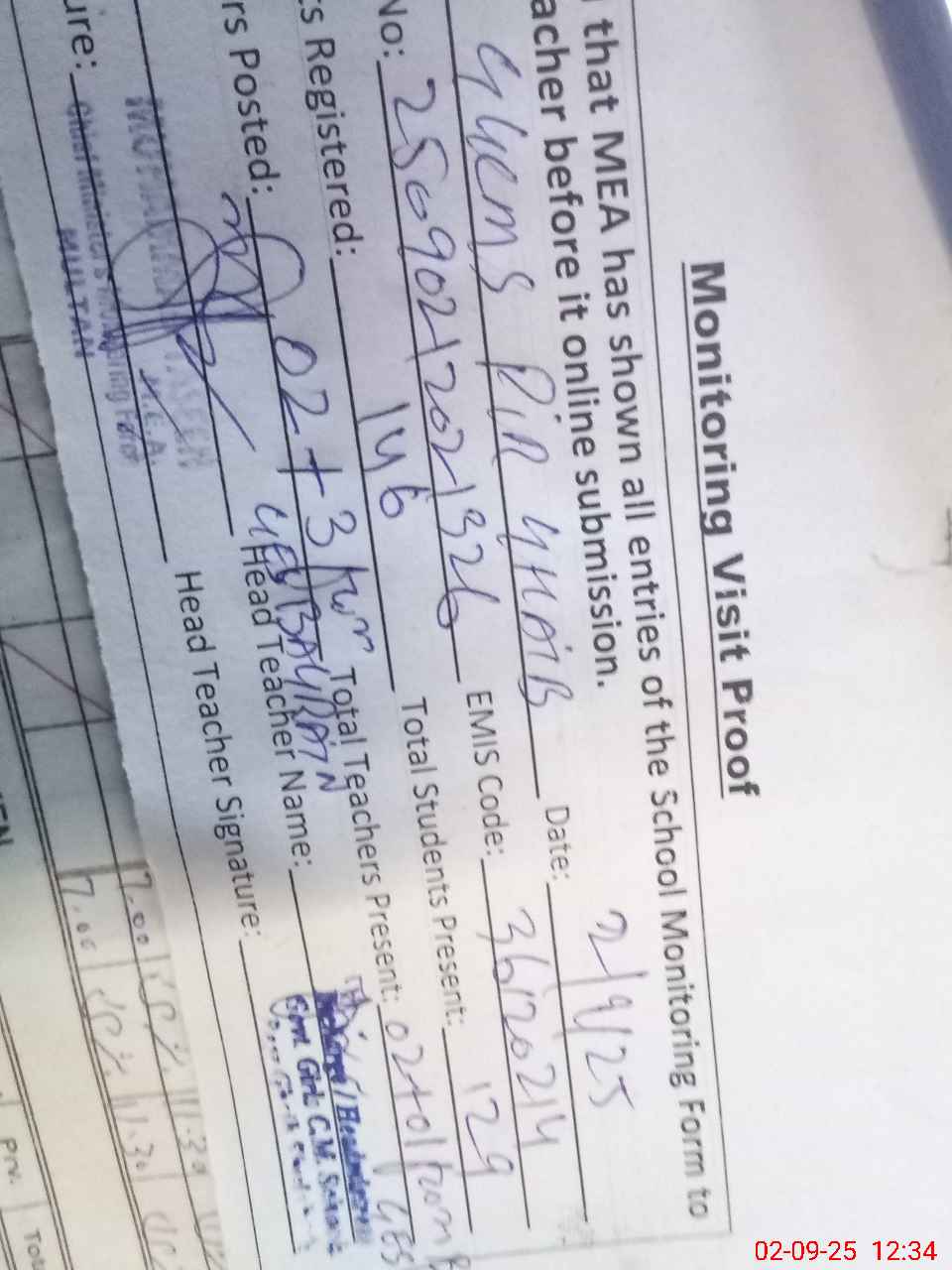 | Attendance Register | Head Teacher | MEA with School | Visit Proof |
