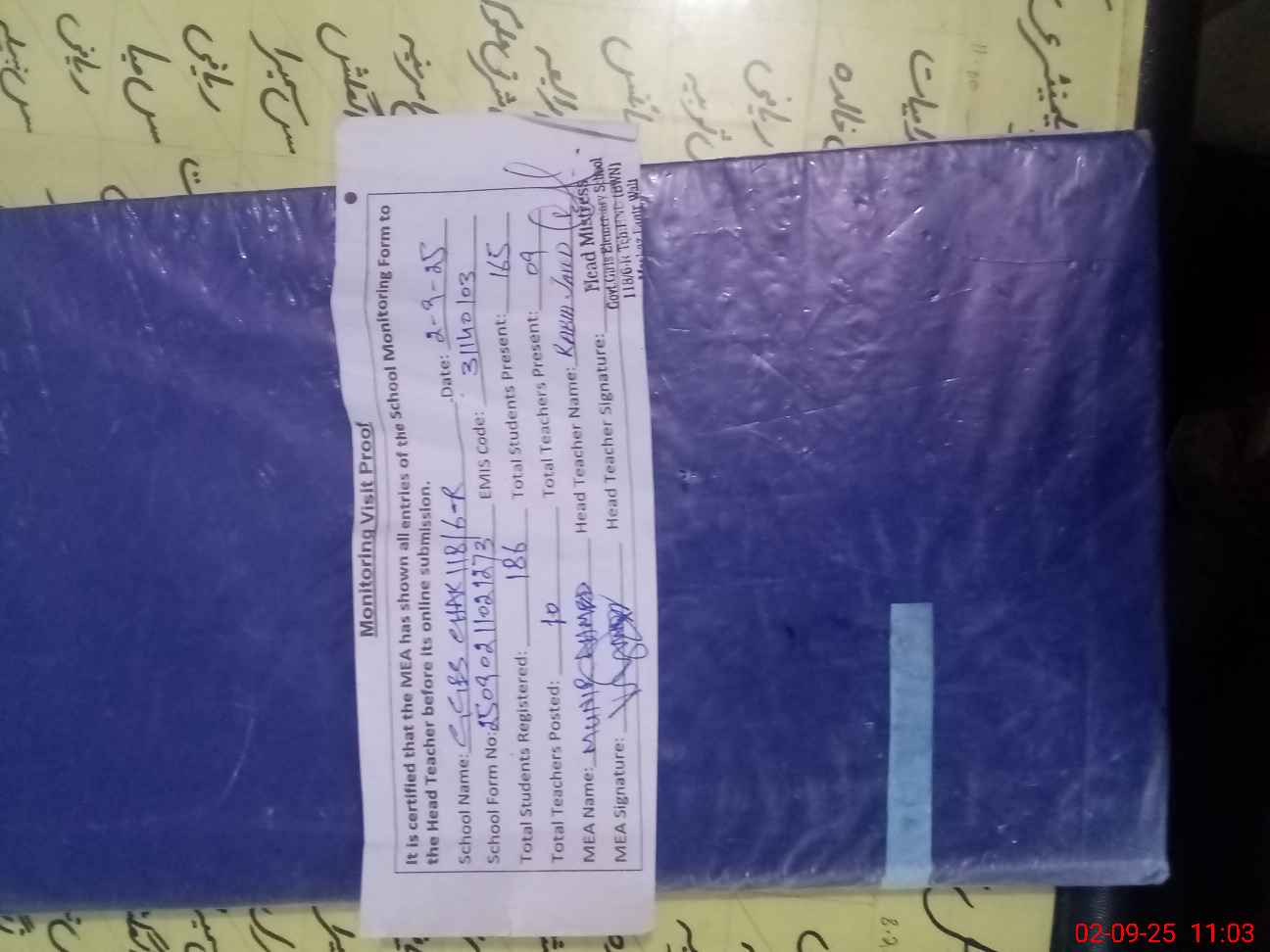 | Attendance Register | Head Teacher | MEA with School | Visit Proof |