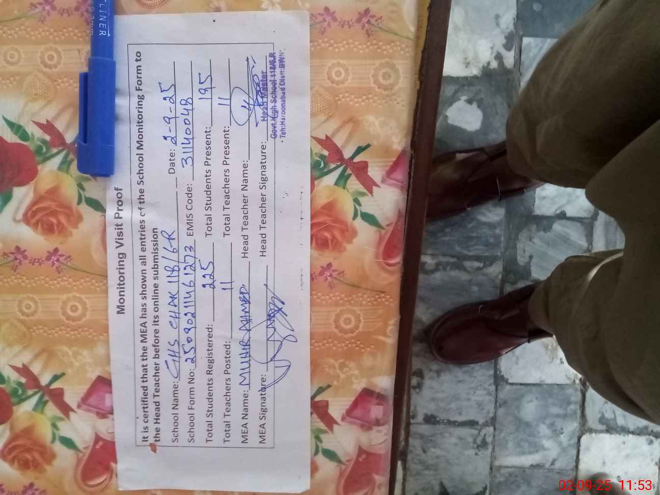 | Attendance Register | Head Teacher | MEA with School | Visit Proof |