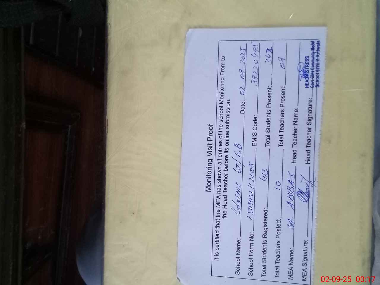 | Certified that this School was Inspected by the Undersigned MEA/DMO Today and the Information Stated Above is as Per Record. | |||||