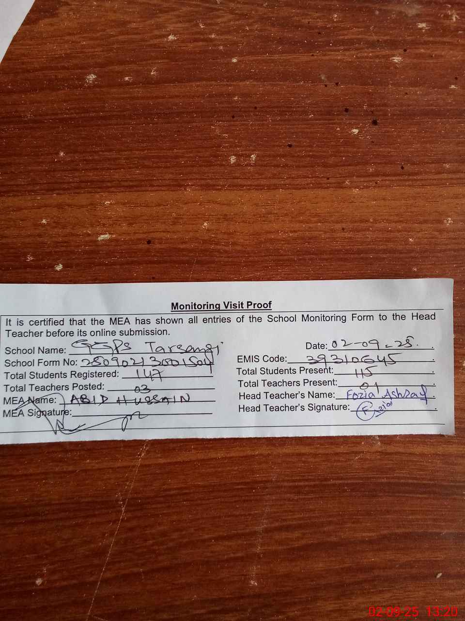 | Attendance Register | Head Teacher | MEA with School | Visit Proof |