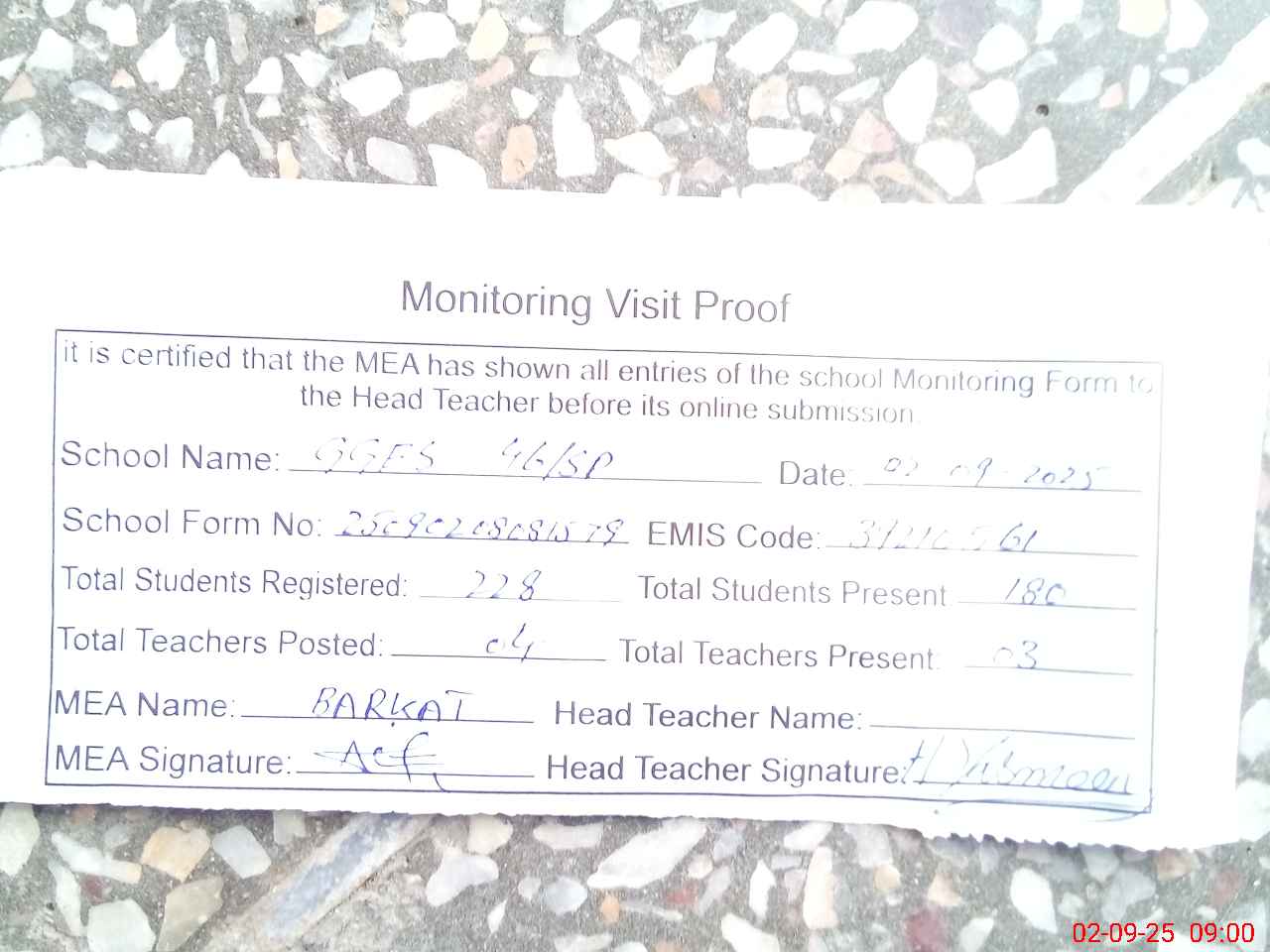 | Attendance Register | Head Teacher | MEA with School | Visit Proof |