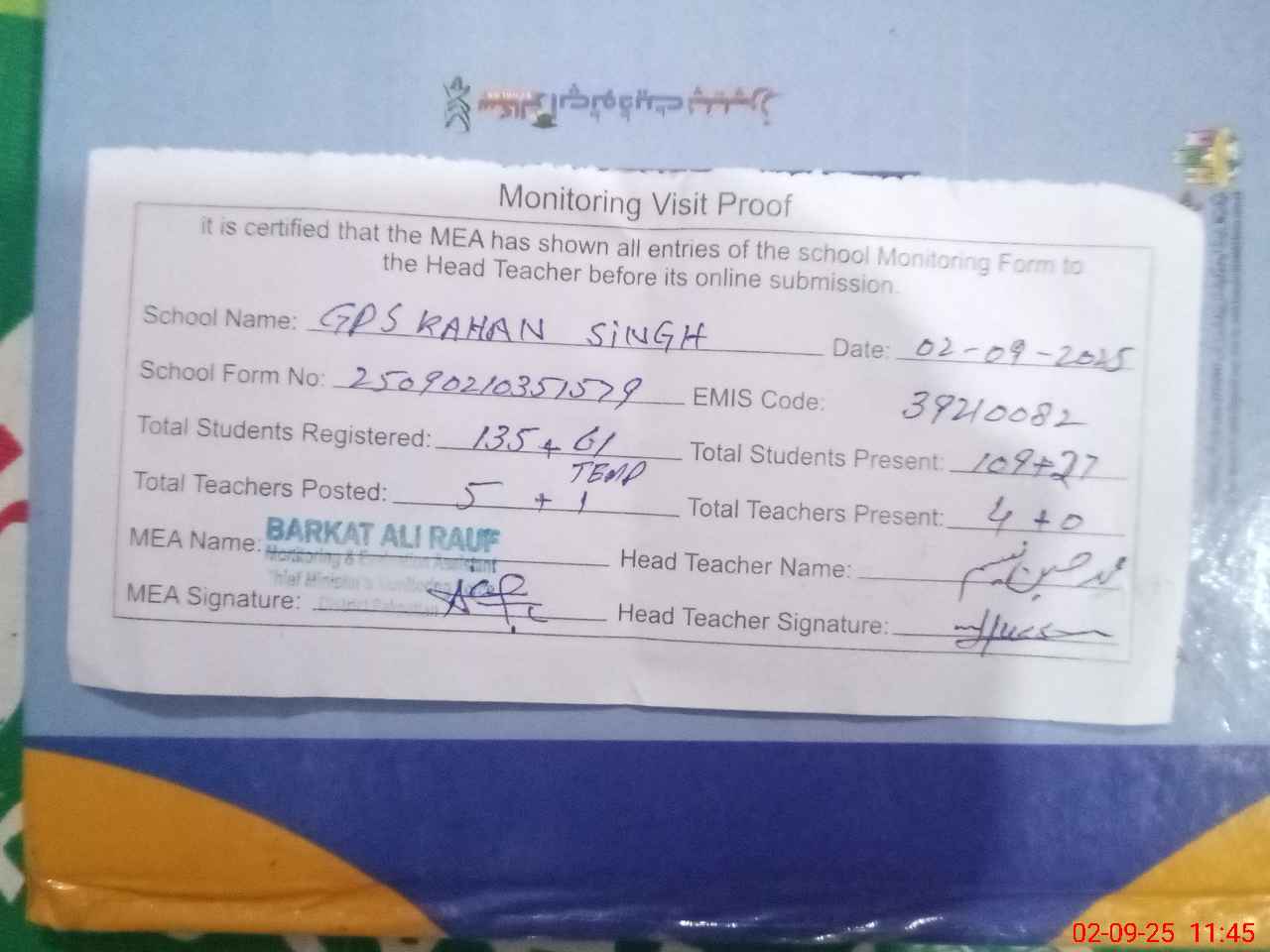 | Attendance Register | Head Teacher | MEA with School | Visit Proof |