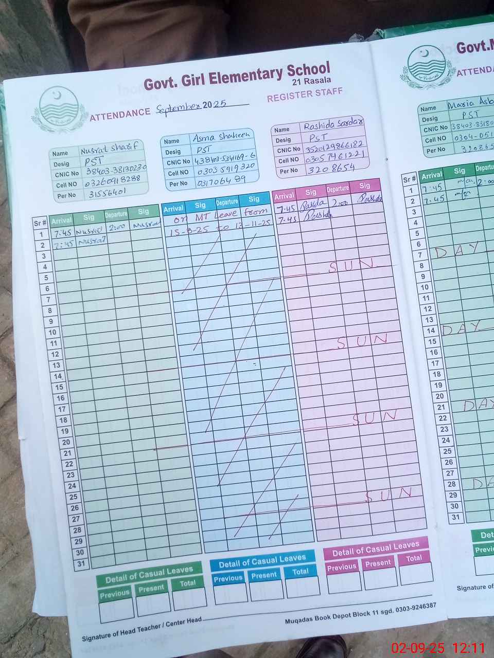 | CNIC | Full Name | Designation | R/C | Absence During Last Calender Month |